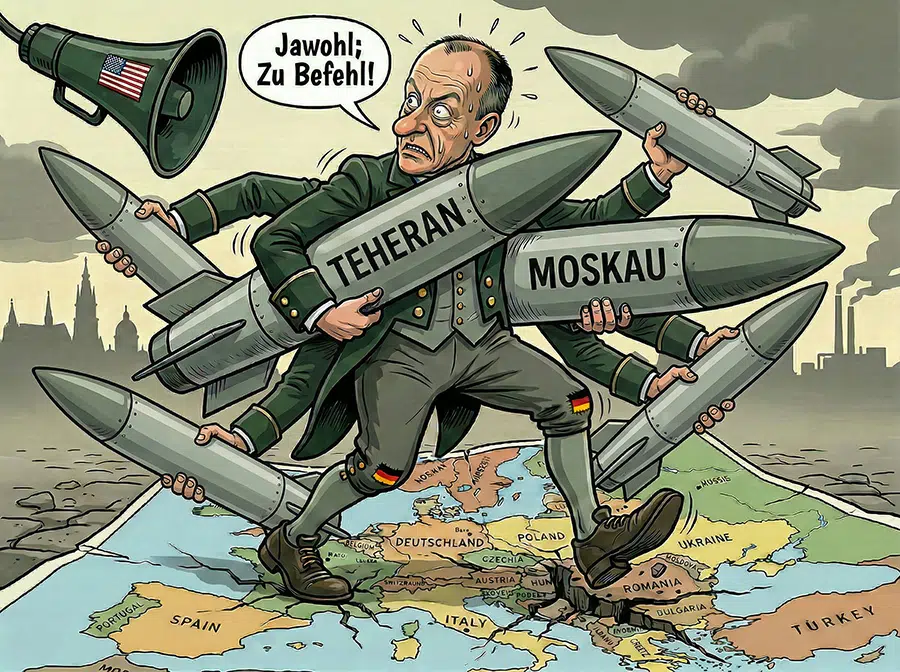 Unsere Gesellschaft nimmt all das überwiegend teilnahmslos hin, denn von einer großen Friedensbewegung mit relevanter Wirkung kann man nicht sprechen. Doch wer nun meint, mit Russophobie das sich zunehmend wieder ausbreitende aggressive deutsche Wesen ausreichend beschrieben zu haben, muss zunehmend feststellen, dass er nicht in dessen tieferliegende Schichten eingedrungen ist. Schon ein Blick auf die deutsche Haltung zum Krieg im Gaza verdeutlicht das, doch das deutsche Wesen hat inzwischen noch mehr zu bieten. Als Israel den Iran im vergangenen Jahr angriff, meinte Bundeskanzler Friedrich Merz am 17. Juni im ZDF: